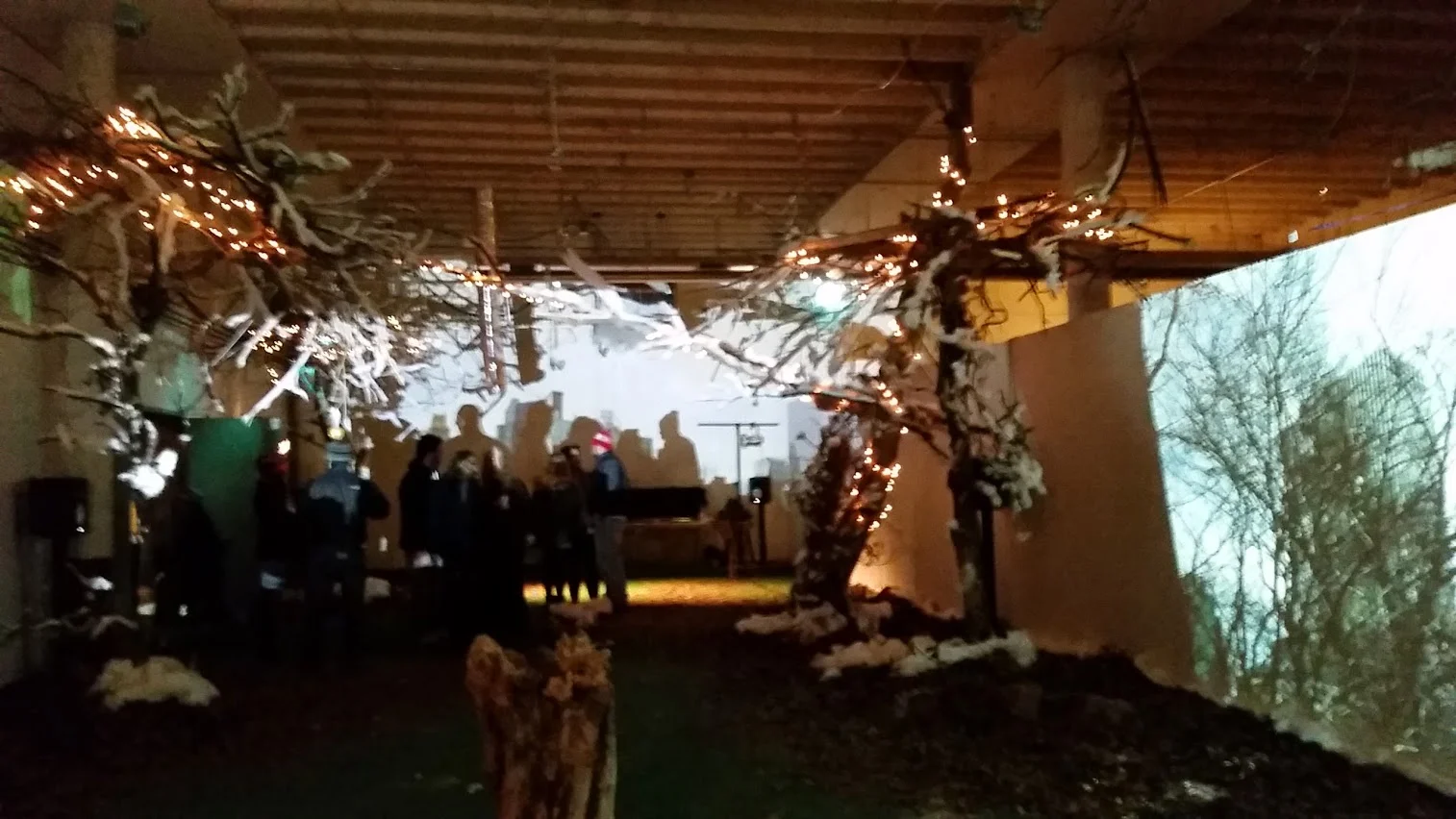 The second installation was an immersive 12.1 system over a 50'/30' space. Six speakers were suspended evenly across the space, 15' above the listener. Another six speakers were distributed at each corner and halfway on the long walls. The sub was placed in the middle of the front short wall. Moving and static sound and score surrounded and engaged the listener. Sounds of birds, cars, trees rustling, people walking by and planes overhead were all utilizes and manipulated across the space. This sound and score was accentuated by projection and set design the patron walked through.